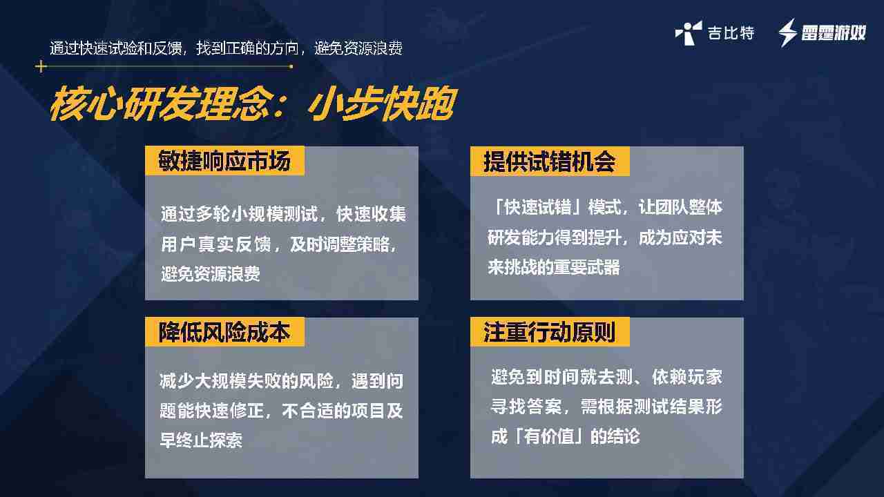 小步快跑不是找答案,,,,而是验证答案。。。我们之前有项目是这样的,,有些制作人会有几个方向觉得都可以做,,但是不确定做哪一个,,会选择几个都做,,,做完拿到市场跑,,跑出哪一个更好,,基于这个再做后续的研发和拓展。。。。但这种情况最容易出现一个问题,,,可能被玩家裹胁,,玩家说这个点不错、、、、那个点不错,,,,到底听还是不听,,,,不听感觉是无视玩家的反馈,,,,听的话,,可能自己没想清楚导致研发思路发生偏颇。。。。所以针对这一点后面自己复盘整理,,,发现制作人自己心里要有数,,,要做自己觉得好玩的,,,,而且明确知道这个东西是你想做的,,,,然后拿到市场验证这个答案是不是对的,,,,而不是拿一堆答案找哪一个答案更好。。