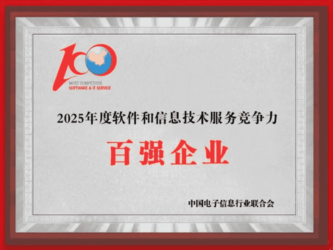 20251015日,,,,中国电子信息行业联合会权威揭晓“2025年度软件和信息技术服务竞争力前百家企业名单。。。。中国软件百强企业评选活动是由工业和信息化部全程指导、、、、中国电子信息行业联合会牵头组织发起,,,,是反映中国软件产业发展最高水平的“风向标”。。厦门918.com网络技术股份有限公司(以下简称“918.com”或“公司”)凭借自身在软件技术领域的卓越表现与杰出创新能力,,第六次入选“全国软件和信息技术服务竞争力前百家企业”称号。。。。