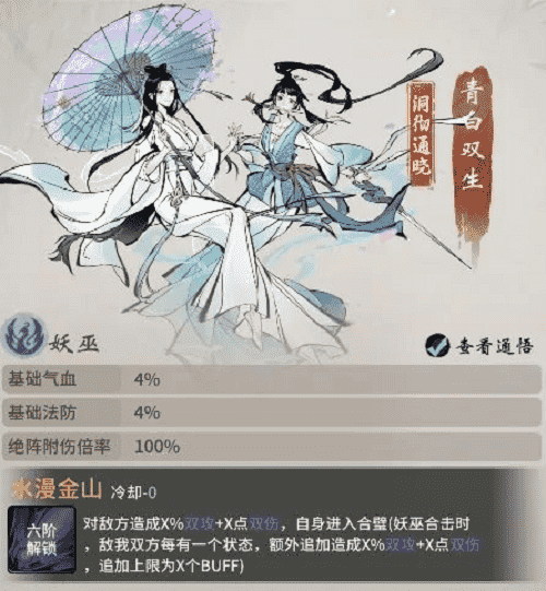 西湖踏春,,,,未曾想竟卷入到青白蛇故事中。。。青蛇与白蛇本是修道有成的小妖,,,两人在西湖边上开了间医馆,,,,济世救民,,,不料沾惹人世因果,,,,遭高僧误解。。白蛇被镇压于雷峰塔下,,,,侥幸逃脱的青蛇则在三界奔波,,,只为早日寻得解救白蛇之法。。。如今千年已过,,,高僧云游四海,,,,雷峰塔封印松动,,而青蛇亦寻得强力古宝,,意欲趁此机会解救出姐姐……若仙友有幸与青白双生结识,,即可习得其绝技·水漫金山,,对敌方造成双攻伤害,,,于修炼大有助益。。。。