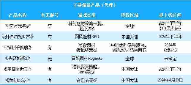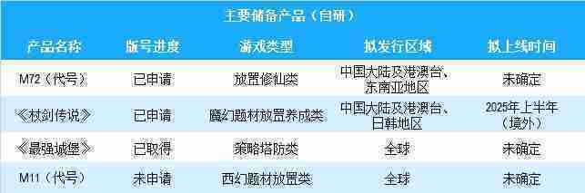 公司有多款储备产品,,,涵盖放置类、、、、策略类、、、、RPG、、、Roguelike等多元化游戏品类,,,,储备的主要自研和代理产品如下:::