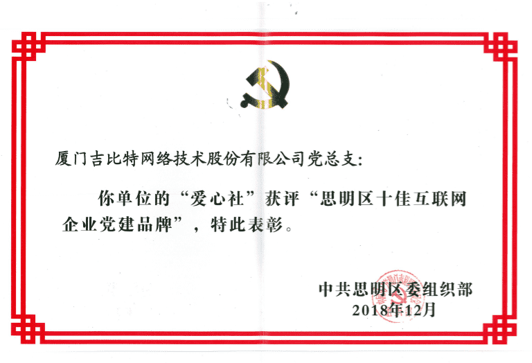 经初审评选、、、、网络评选和专家评审等环节,,,"厦门918.com网络技术股份有限公司党总支-爱心社" 从全区28个参评党建品牌中脱颖而出,,获评"思明区十佳互联网企业党建品牌"。。。