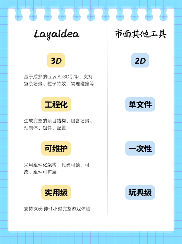 基于LayaAir引擎,,,,LayaIdea构建了一套完整的工业级AIGC开发流程,,,,实现了从策划文档到完整3D游戏项目的自动化生成,,,,与市面现有AIGC工具在技术能力、、、、实用性上形成显著差异,,,,具体对比如下::